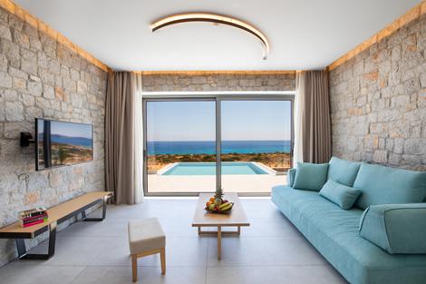 Aros Luxury Villas ligt echt op een prachtig plekje, wat een uitzicht, wauw. Eigenaren Panagiotis and Yiannis hebben van de villa's een topadresje gemaakt. Als ik hier mijn villa binnen wandel, dan valt meteen de minimale styling op. Het geeft rust en ruimte in dit modern ingerichte verblijf. Bovendien is er ook nog een traditioneel tintje terug te vinden in de villa. Daar hou ik zo van! Als ik namelijk naar de muren in de woonkamer kijk, dan voel ik meteen dat ik in Griekenland ben: de stenen muren, die voor dit heerlijke land zo typerend zijn, zijn prachtig. Dit is echt het perfecte adresje om een hele fijne vakantie met je geliefde door te brengen. Nadat ik het terrein een klein beetje heb verkend met de mooi aangelegde, knusse zwembaden die uitkijken over zee, strijk ik neer op het terras van mijn villa. Ik denk dat ik zo even een duik ga nemen in mijn eigen zwembad. Verder ga ik niet veel meer doen vandaag. Alleen maar genieten van de ondergaande zon en een goed glas wijn. En van het schitterende uitzicht over Ardani natuurlijk! Morgen ga ik naar het schattige Pouliou Potami strand. Ik zag op de kaart dat dit maar een klein kwartiertje wandelen is. Het ligt in een heel klein baaitje en het lijkt me daarom heerlijk om hier een frisse duik te nemen. Daarna ga ik op het kleine strandje genieten van het zonnetje en een tijdje wegdromen… Wanneer ik helemaal relaxed ben, dan zoek ik een leuke taverne op om gezellig iets te gaan eten. Esperida family taverna in Amoopi, op circa 2 kilometer serveert heerlijke Griekse maaltijden, dat lijkt me wel wat. Ik heb nu al zin in morgen en de dagen erna. Karpathos is een heel mooi eiland, dus ik kijk er heel erg naar uit om iedere dag een ander plaatsje of strandje te bewonderen. Ik denk dat ik begin met een bezoekje aan Menetes, om daar de kerk te bezoeken en langs de kleurrijke huisjes te wandelen.