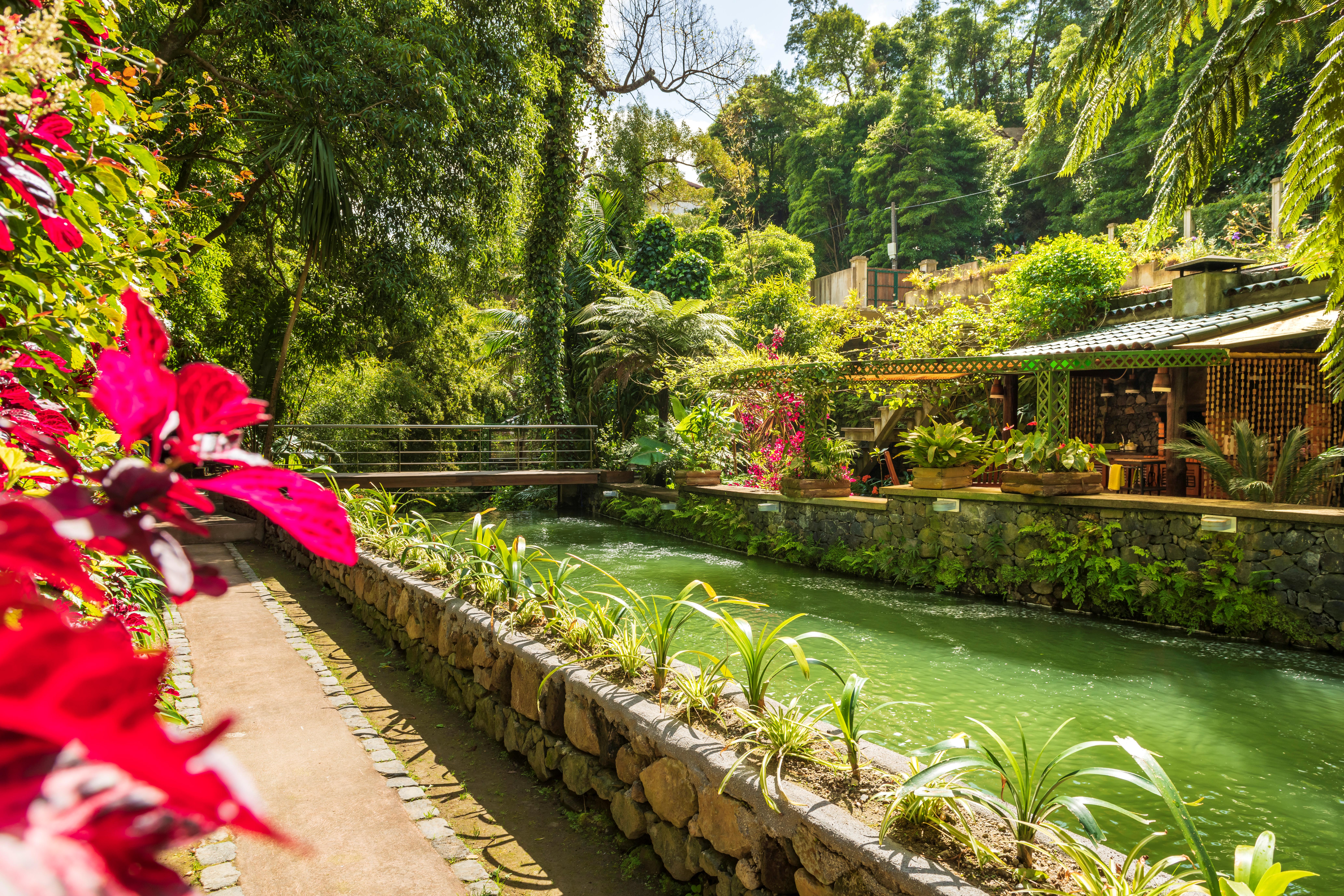 Appartementen Quinta da Mo is oprecht één van de meest bijzondere adresjes die ik ken. Het is werkelijk alsof ik een sprookje binnenkom. Lopend over een smal paadje ben ik omgeven door tropische vegetatie, fruitbomen én het kabbelende geluid van de rivier. In de verte zie ik de oudste watermolen van Furnas liggen. Voorheen was dit ook nog een timmermansbedrijf, waar oude stoelen werden gemaakt. Nu is het een unieke plek waar je kunt overnachten. Als ik verder loop hoor ik tjilpende geluidjes van vogels om mij heen. Ze geven mij het gevoel alsof ik midden in de jungle loop. Ik ben werkelijk sprakeloos van de schoonheid hier! Bij de receptie ontmoet ik de goedlachse eigenaresse Luisa Valerio, afkomstig uit het vaste land van Portugal. Ik hoef niet te vragen waarom ze besloot hier te gaan wonen, want het antwoord zie je direct. Maar er zit een mooi verhaal aan vast. Voorheen was ze namelijk stewardess, voornamelijk in Afrika. Hier heeft ze ook haar man ontmoet en na hun trouwerij in Angola, besloten ze zich te vestigen in zijn huis, op het eiland São Miguel. Luisa besloot vervolgens bij een bank te werken, maar na haar pensioen kwam een nieuwe droom uit; het aankopen en renoveren van deze unieke plek. Als ik vraag waar ze het meest trots op is, zegt ze zonder te aarzelen direct: de prachtige tuin is én het ontvangen van gasten over de hele wereld. Haar gastvrijheid voel ik dan ook overal, ze is trots om dit paradijs te delen met iedereen. Voor mij is dit absoluut nóg een reden waarom ik mij hier zo ontzettend relaxt voel... De adembenemende natuur ontdekken gaat hier vanzelf, maar ik kan het natuurlijk ook beleven vanaf het water. Ik besluit een bootje te huren, direct voor de deur. Peddelend over de rivier blijf ik maar foto's maken van de flora & fauna! Het lijkt steeds mooier te worden. Na mijn fantastische vaartocht is er een barbecue, waar ik de lokale lekkernijen en drankjes proef. In deze omgeving valt alles op zijn plek! Alles klopt en ik geniet met volle teugen. Ik overnacht zelf in de oude watermolen, gebouwd in 1860. Deze lange geschiedenis ervaren is een beleving op zich. Ik val in een diepe slaap, maar bij het ontbijt lijk ik alsnog te dromen..